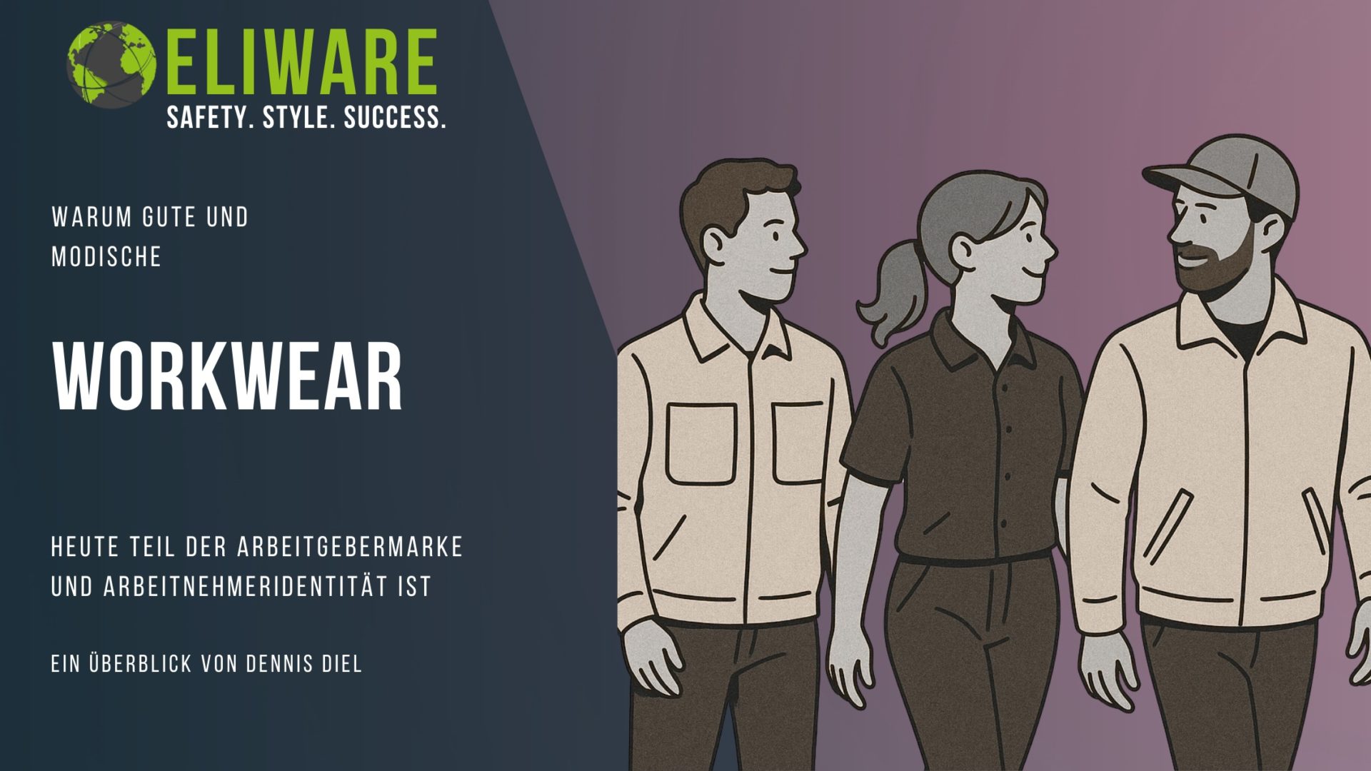 Auf der Grafik sind zwei stilisierte Arbeiter zu sehen. Der eine trägt einen alten Blaumann. Die Figur ist ganz in grau. Ein Pfeil nach rechts symbolisiert die Weiterentwicklung der Arbeitskleidung hin zu Figur 2 - dem Arbeiter in moderner Work Wear des Jahres 2025. Die Beschriftung am linken Bildrand ist auf Englisch. "How Workwear became a Hightech-Tool. An Essay by Dennis Diel."
